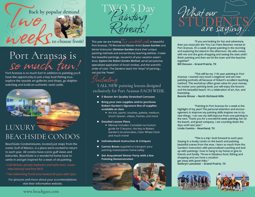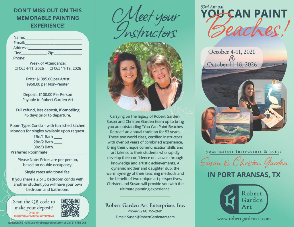 Painting Workshops Join us October 4th-11th or October 11th-18th, 2026 for the next “You Can Paint” Beach Getaway in Port Aransas, TX! Click Here - Make your $100 deposit today!